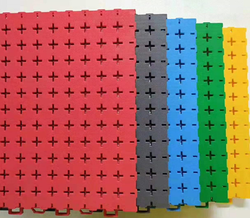 由于產品表面為網狀鏤空結構,地板的底部有水槽,所以清洗地板或雨后均無積水存在,保證了運動地板的利用率。